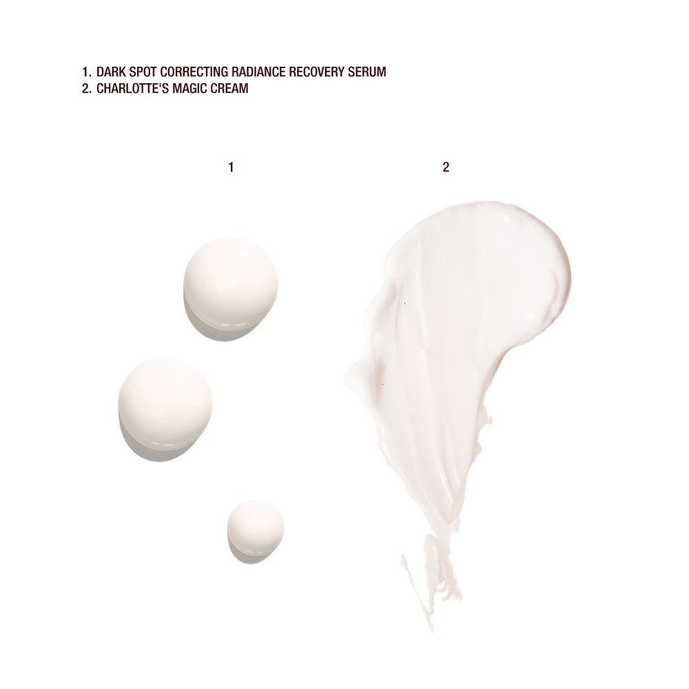 ONLY available on charlottetilburymart.com and the App, this kit includes my Dark Spot Correcting Radiance Recovery Serum to even the appearance of skin tone with laser-like precision, and Charlotte's Magic Cream 15ml to give skin my famous immediate skin revival with glowing results! Shop the duo to save a magical 5%!*