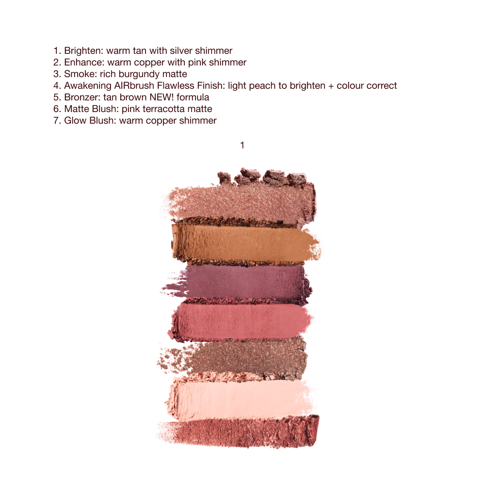 Instant Look In A Palette! Neutral warm tones make you look dreamy, healthy + bronzed! Easy to dial up from everyday makeup to a soft glam party look.