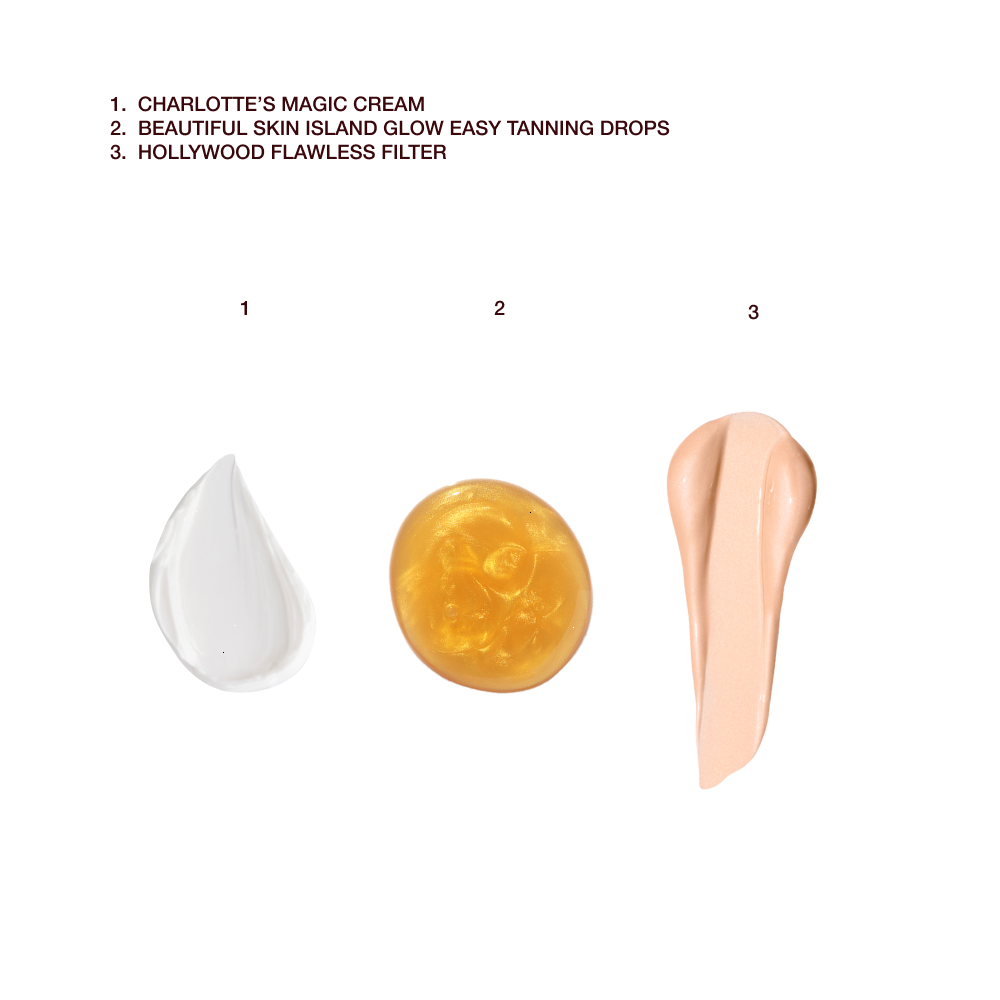 ONLY available on charlottetilburymart.com and the App, this kit includes Charlotte's Magic Cream 10ml, Beautiful Skin Island Glow Easy Tanning Drops, Mini Hollywood Flawless Filter and Joyphoria 10ml.