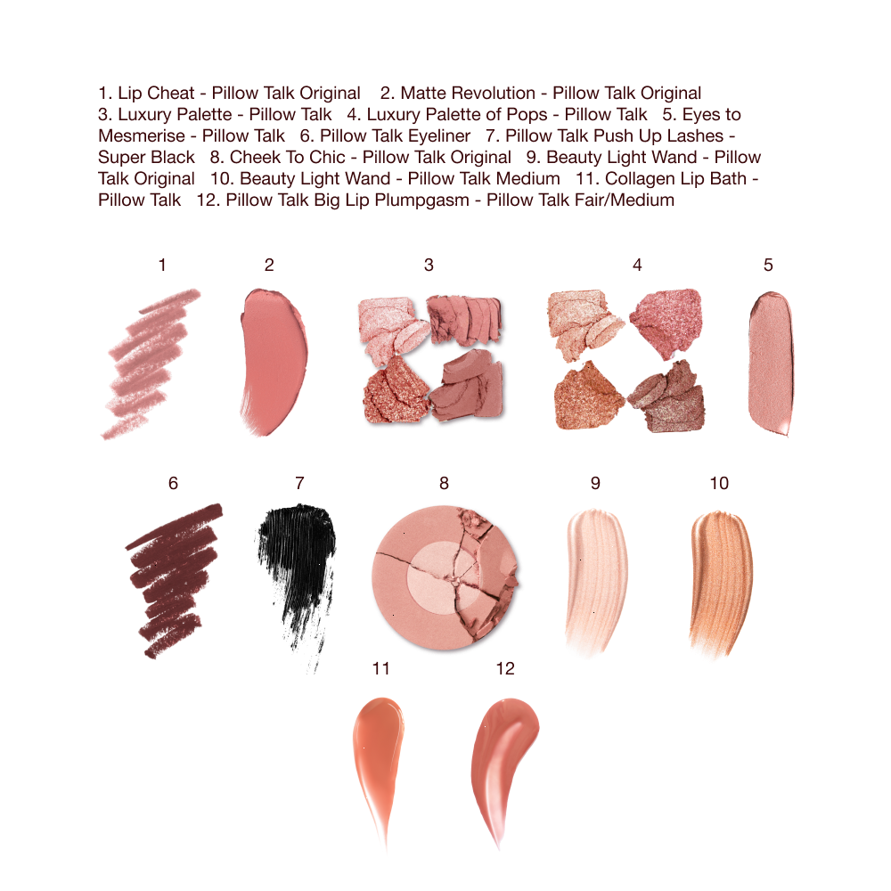 Inside, you’ll find globally-loved beauty icons including my Pillow Talk Lip Cheat to reshape and resize the look of your lips, Pillow Talk Push Up Lashes! mascara for enhanced, longer, lifted looking lashes, my Luxury Palette of Pops for bigger, brighter looking eyes, my iconic Beauty Light Wands for cheekbones that glow forever, plus my Pillow Talk Big Lip Plumpgasm to supersize and maximise the look of your pout in just one swipe!