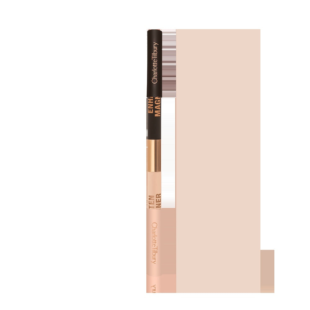 Darlings, my The Super Nudes Eye Liner Duo is the backstage secret to EXAGGERATED, BIGGER, BRIGHTER-LOOKING EYES! This black-brown and nude eyeliner duo allows you to PLAY WITH LIGHT and DARK, brightness and shade, to create a more FELINE, MESMERIC EYE that’s perfect with a natural nude makeup look!