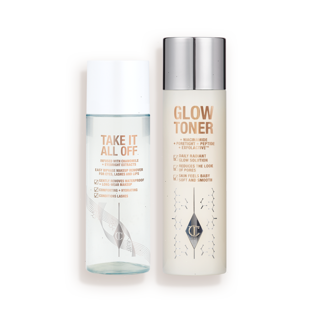 Darlings, take it all off and get GLOWING SKIN with my NEW! Take It All Off & Glow kit! This nourishing skincare duo includes my oil-based bi-phase makeup remover for your eyes, lashes and lips, plus my pore-refining, acid-free toner for glowing skin!